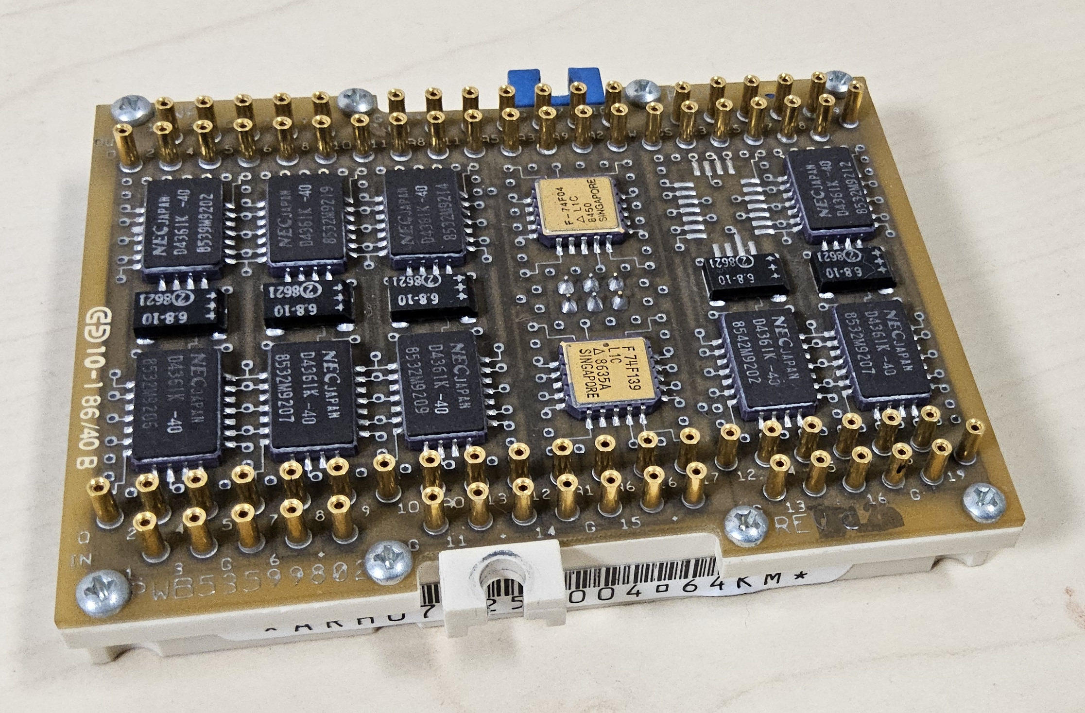 Seine Kapazität beträgt 128 Kbyte. Es ist beidseitig mit je 9 Speicherchips vom Typ NEC D4361K, einem 64 kBit statisches RAM mit 40ns Zugriffszeit. (8 Bit plus Parity).