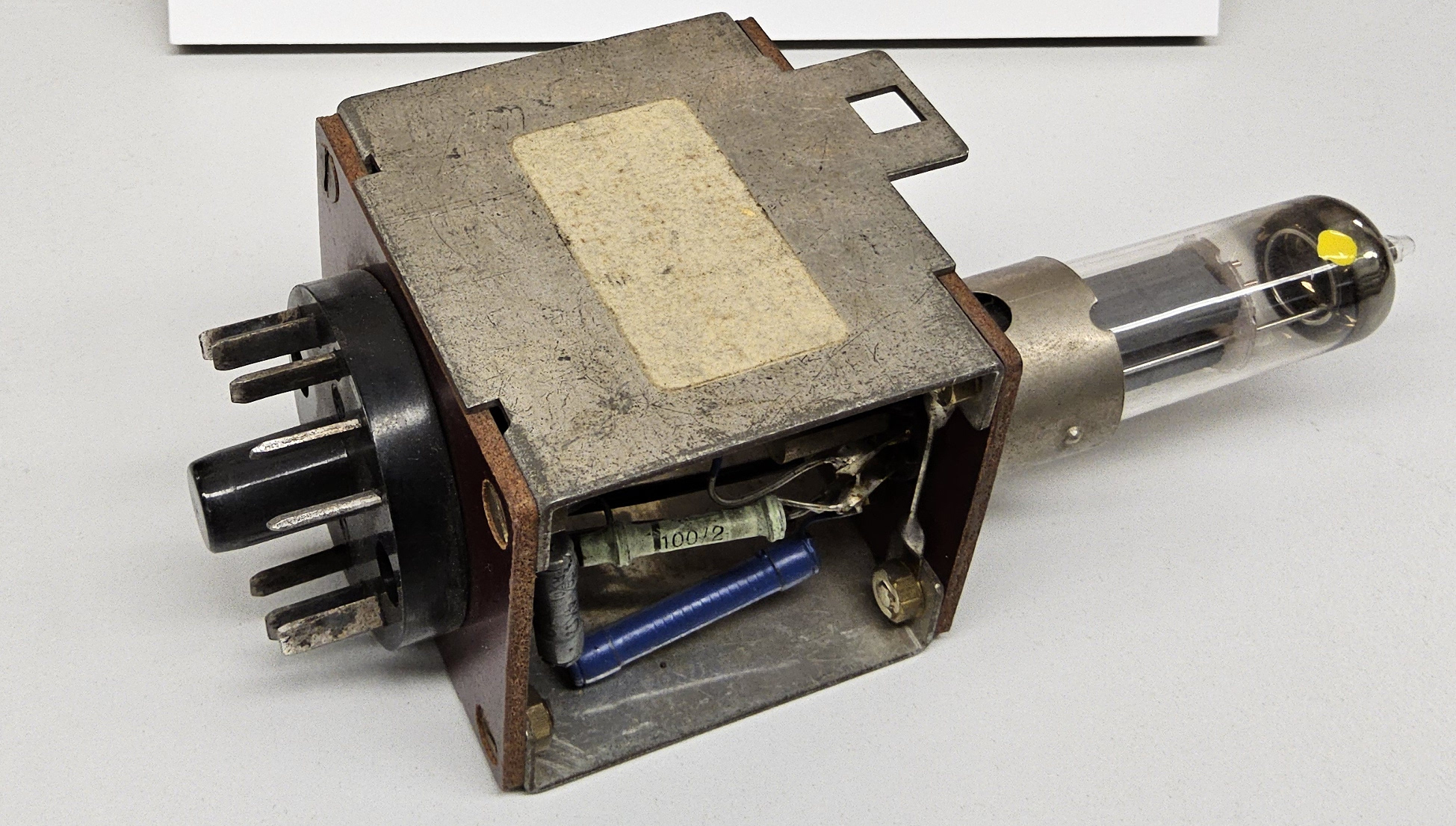 Der hier beschriebene Baustein ist ein 1-bit Pufferspeicher mit invertierenden Ausgang, der mit einer Röhre des Typs E90CC von Valvo realisiert wurde.