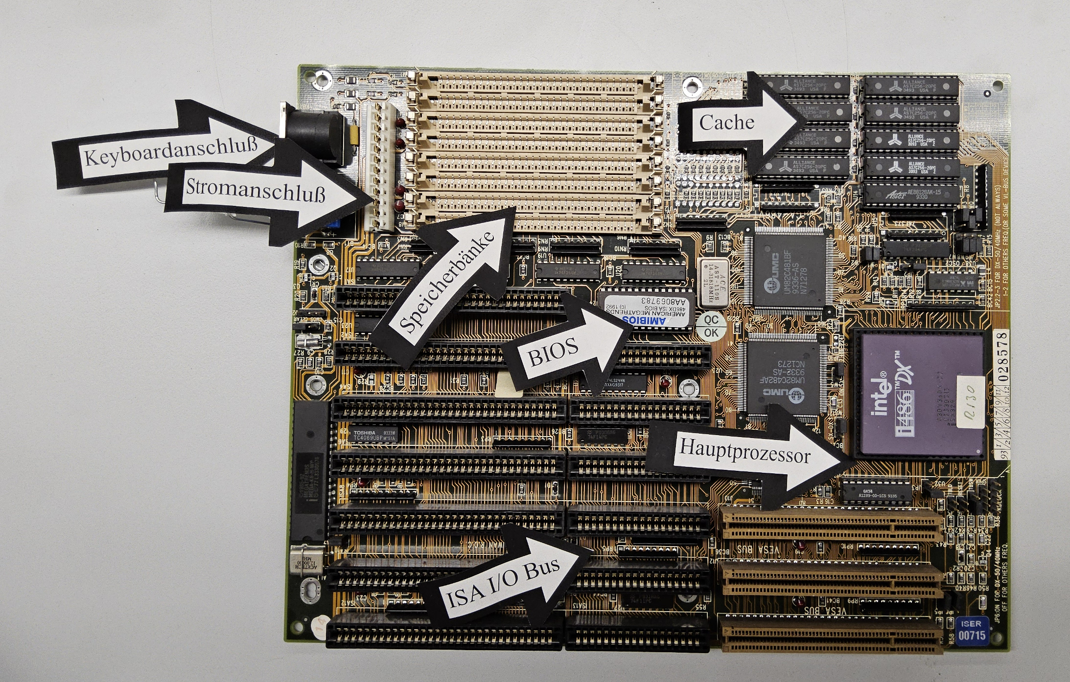 80486er Demoboard mit beschrifteten Hauptbestandteilen.