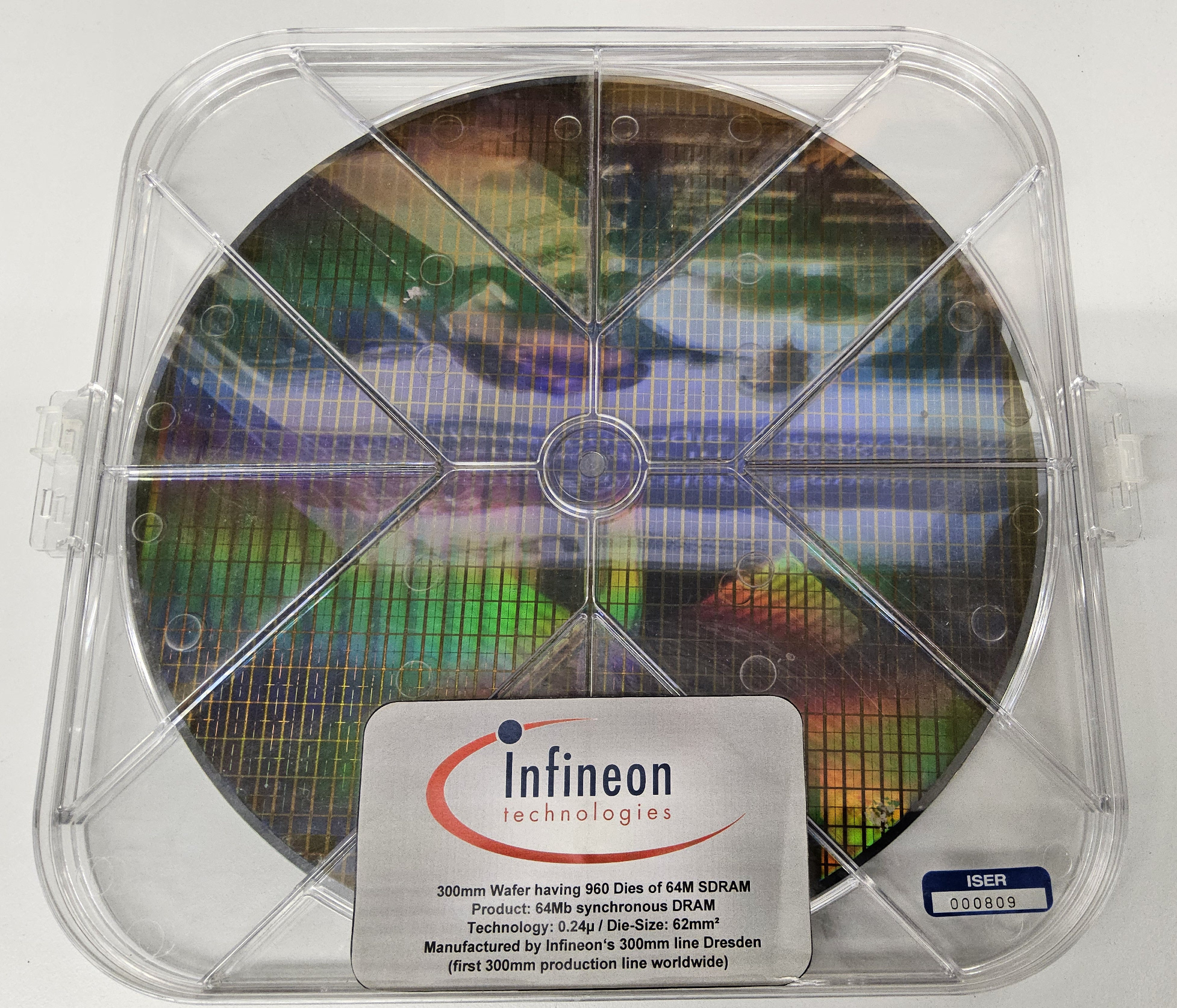 300 mm Wafer mit 960 SDRAMs mit 64 MBit im Transportbehälter