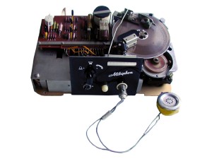 Anrufbeantworer. Als Medium für die Speicherung ist eine Magnetplatte gewählt, die allerdings keine Spuren hat, sondern wie eine Schallplatte spiralenförmig beschrieben und gelesen wird. Funktionsfähig!