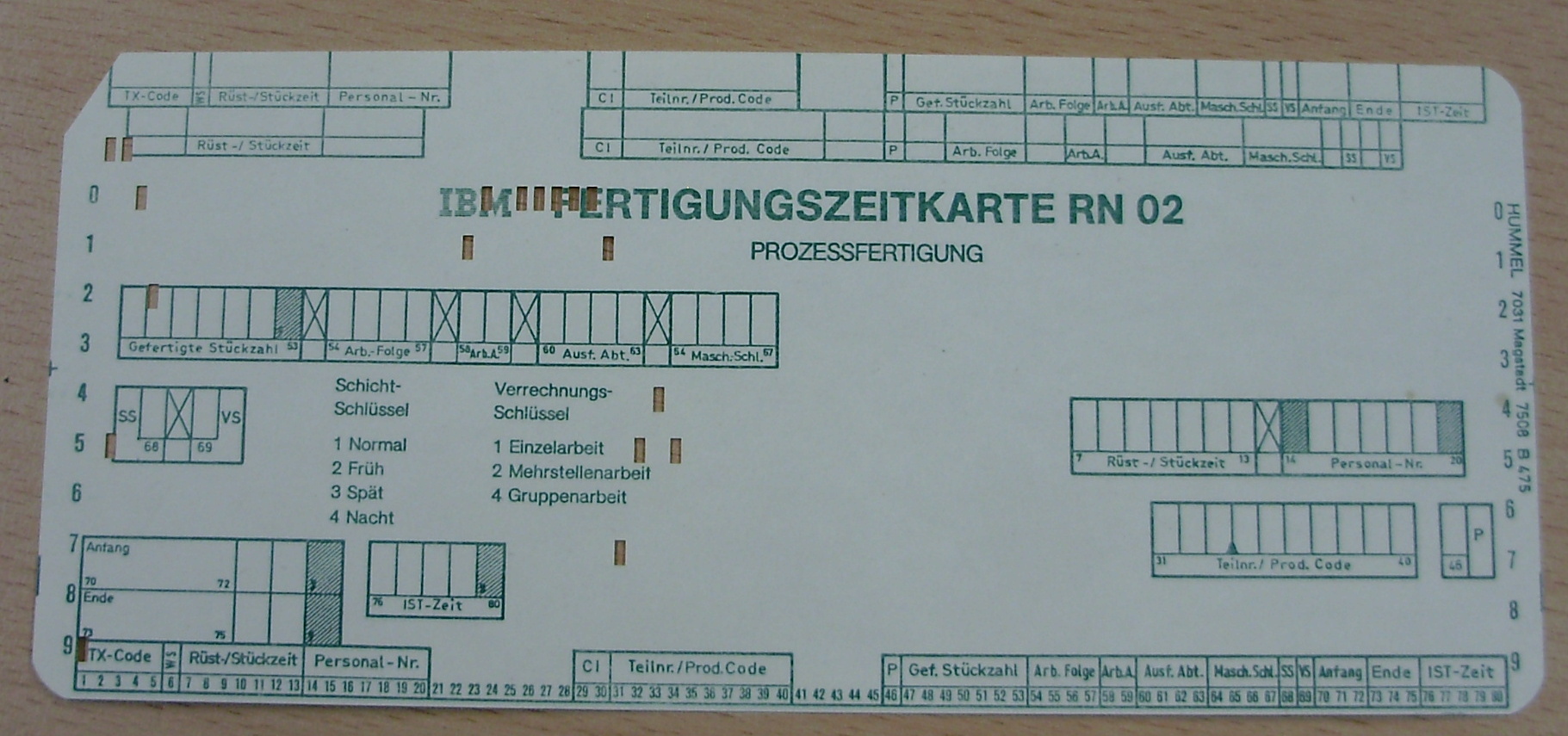 c) IBM Fertigungskarte RN 02. Die eckigen Lochungen sind aber willkürlich.