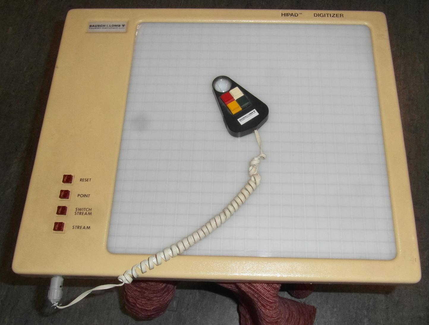 Bei diesem Digitizer fährt man mit einer Art Computermaus mit Fadenkreuz eine Fläche des Digitalisiertabletts ab und digitalisiert die dabei abgefahrenen Linien und speichert sie ab. Wikipedia spricht von einem Zeigegerät für Computereingabe.