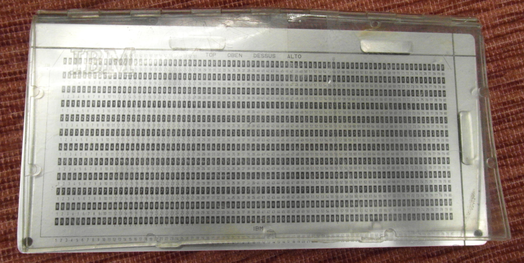Auf diese Schablone wird eine gelochte Karte gelegt und an den Löchern geprüft ob diese mit den auf der Schablone aufgedruckten Feldern übereinstimmen.