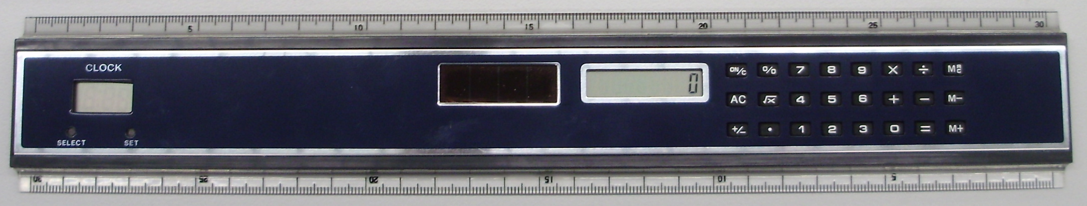 Lineal mit integrierten Taschenrechner und Uhr, solarbetrieben.