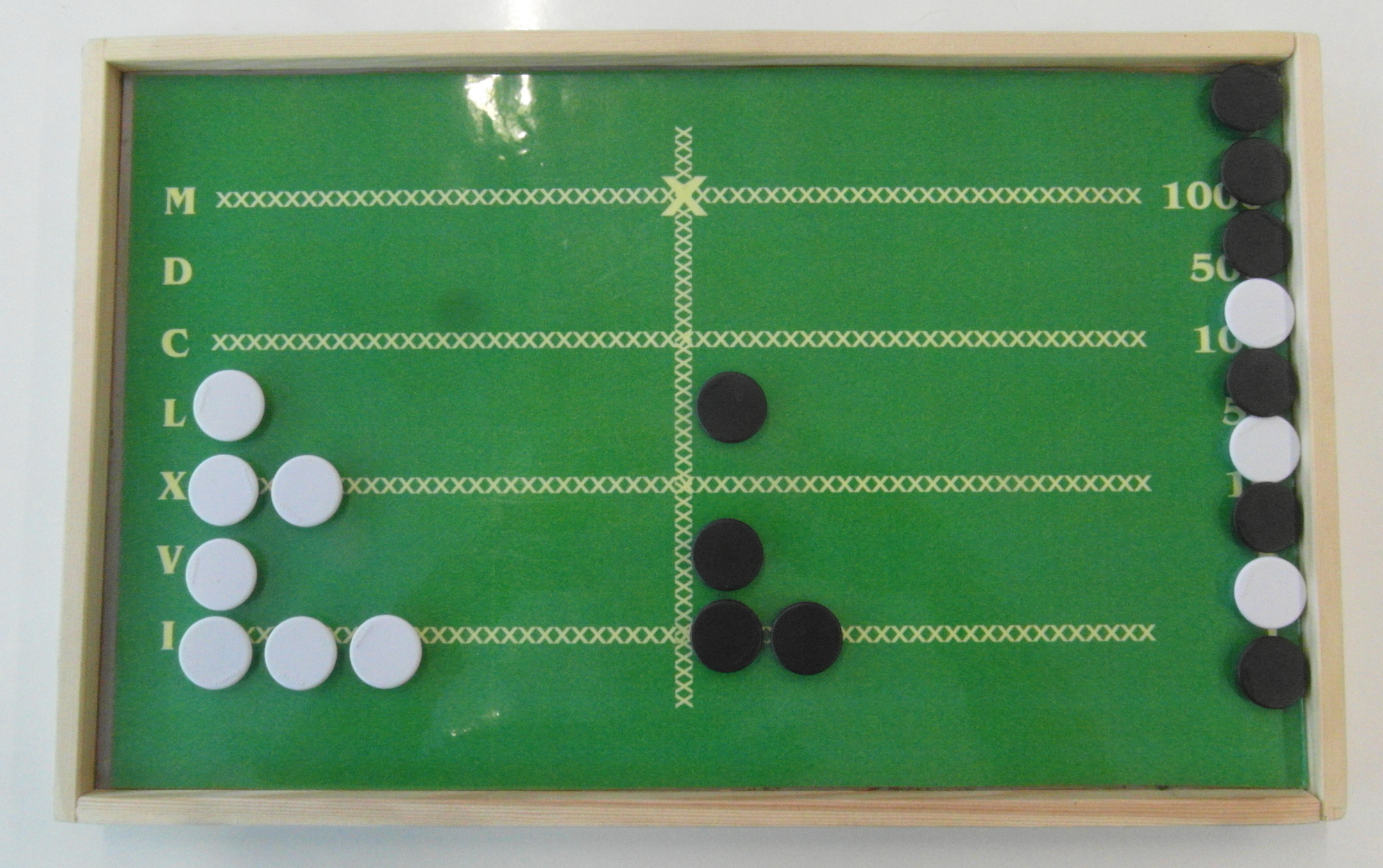 Modell eines mittelalterlichen Rechenbretts für Vorführ- und Übungszwecke mit „Rechenpfennigen“ aus Magneten.