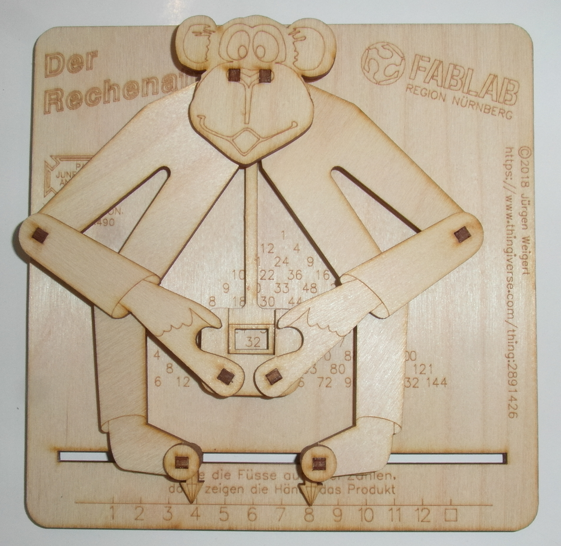 Das Original dieses Lernspielzeug wurde bereits 1916 in den USA vorgestellt. Im Prinzip handelt es sich um eine Einmaleins-Tabelle, deren Ergebnisse so auf der Blechtafel aufgedruckt sind, dass der verstellbare blecherne Affe mit seinen Fingern auf das Produkt der Zahlen zeigt, auf die die Zeiger an seinen Füßen eingestellt wurden (im Bild: 4x8 = 32). Siehe auch I1069.