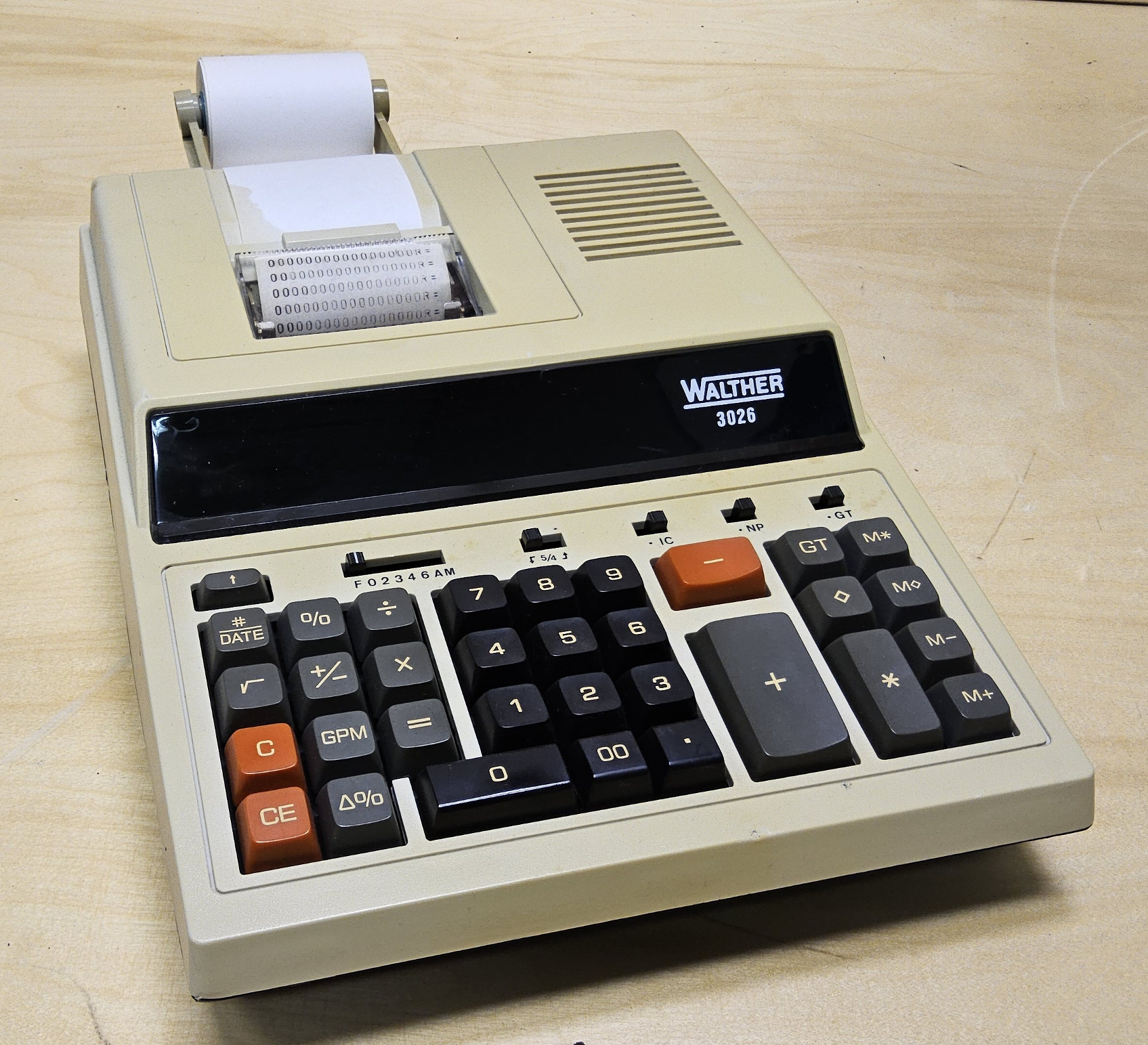 Der Walther 3026 ist ein druckender elektronischer Tischrechner mit Anzeige. Beschreibung:Tischrechner mit Digitronanzeige und Druckwerk mit zwölf Stellen, 5/4-Rundung, Konstantenautomatik, Prozent- und Deltaprozentautomatik, Quadratwurzeltaste, Nichtrechentaste, Gleit- und Festkomma, Postenzähler und saldierendem Speicher.