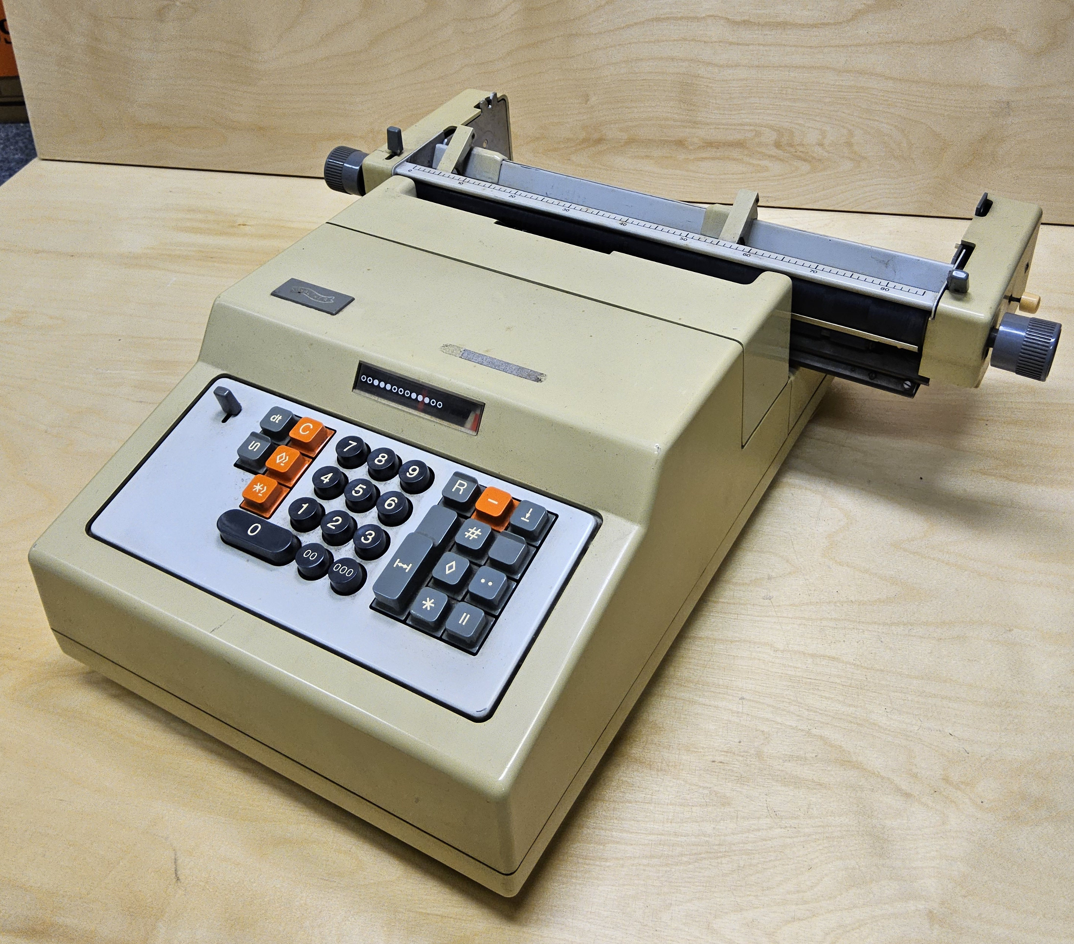 Es ist eine so genannte Organisationsmaschine mit zwei Saldierwerken und 34 cm breitenSchüttelwagen.